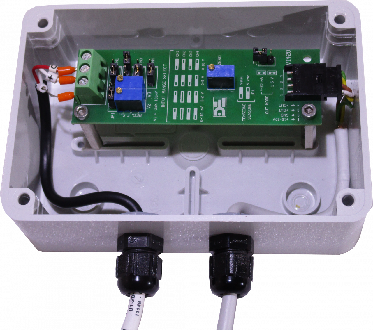 Il modulo è facilmente configurabile tramite ponticelli, ampiamente descritti anche sulla serigrafia della scheda. E' possibile selezionare la configurazione dell'ingresso 0-180 mV, 0-2V, 0-5V o 0-10V e selezionare la tipologia di uscita del segnale (Tensione/Corrente). E' inoltre possibile abilitare un PIN di alimentazione a 5V selezionano l'apposito ponticello sulla scheda. Una volta selezionato ingresso e uscita tramite i due trimmer di 0 e fondo scala è possibili adattare qualsiasi ingresso nel range selezionato nell'uscita desiderata
